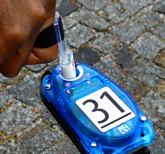 - Chip (SI-Card) que é transportado pelo atleta (normalmente preso ao dedo) para registar a passagem nos pontos de controlo;
